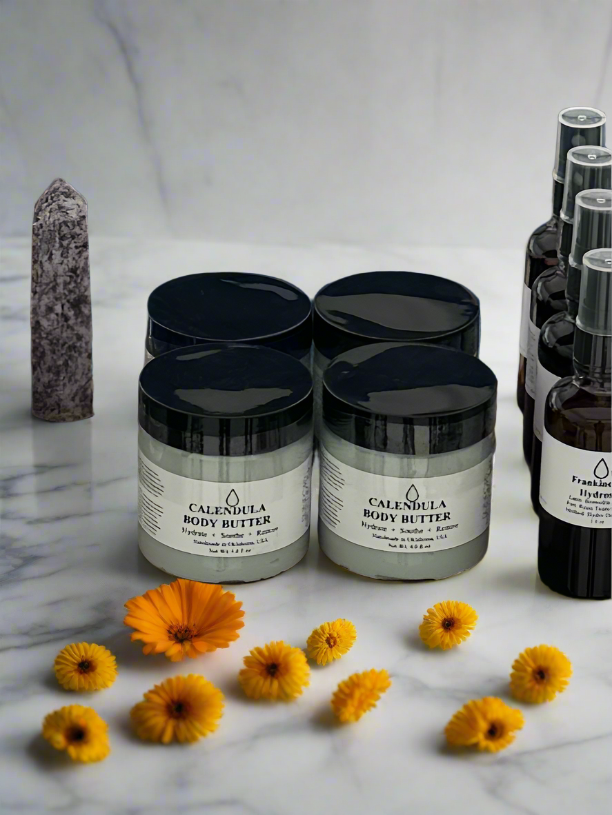 Experience the natural luxury of our Calendula Body Butter 🌼, crafted with care to hydrate and soften your skin. This all-natural formula features the gentle properties of Calendula, known for its soothing qualities 🌿, along with Rosewood and Blue Tansy essential oils for a calming, aromatic experience 🌙